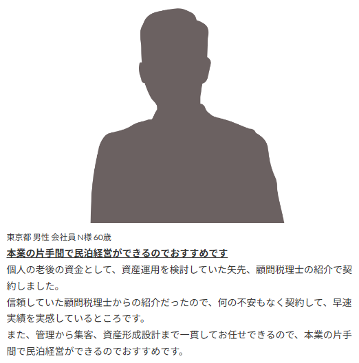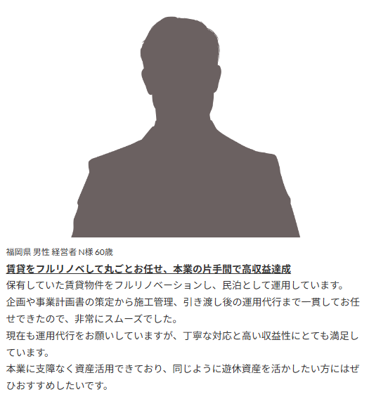 | 事業内容 | 1.住宅宿泊事業法に基づく住宅宿泊事業 2.旅館、ホテル及びその他宿泊所の企画、開発、運営並びに管理 ウィークリー及びマンスリーマンションの企画、開発、運営並びに管理 4.サービスオフィス、シェアオフィス、コワーキングスペース、レンタルスペース及び貸会議室等の企画、開発、運営並びに管理 5.旅行業、旅行代理店業及び旅行幹旋業 6.資産運用コンサルティング 7.不動産の売買、賃貸、管理及びその仲介 前各号に附帯又は関連する一切の事業 |